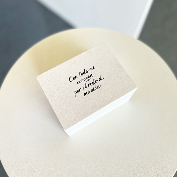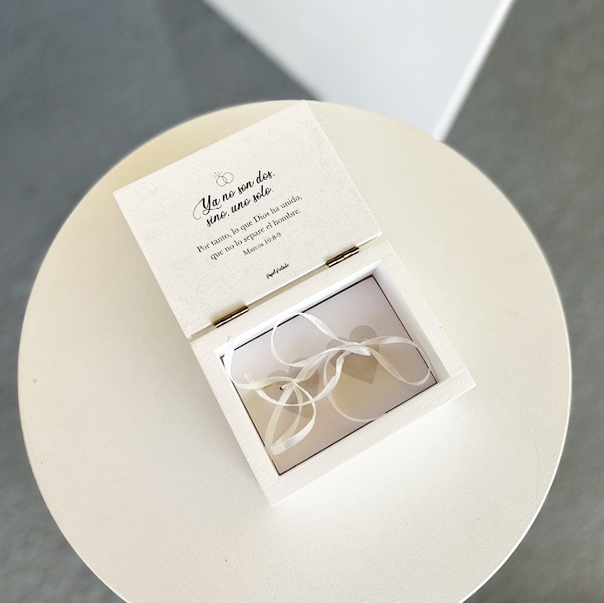 El propósito de nuestras cajitas para anillos es resaltar el versículo de Mateo 19:6. El día de la boda es tan especial que así debe mantenerse el matrimonio por el resto de sus vidas. Es una decisión tan Importante que su unión debe glorificar a Dios. La cajita es un recordatorio de esa unión por el resto de sus vidas, es un gran tesor. Luego, podés colocarla en tu mesa de noche para poner tus anillos.