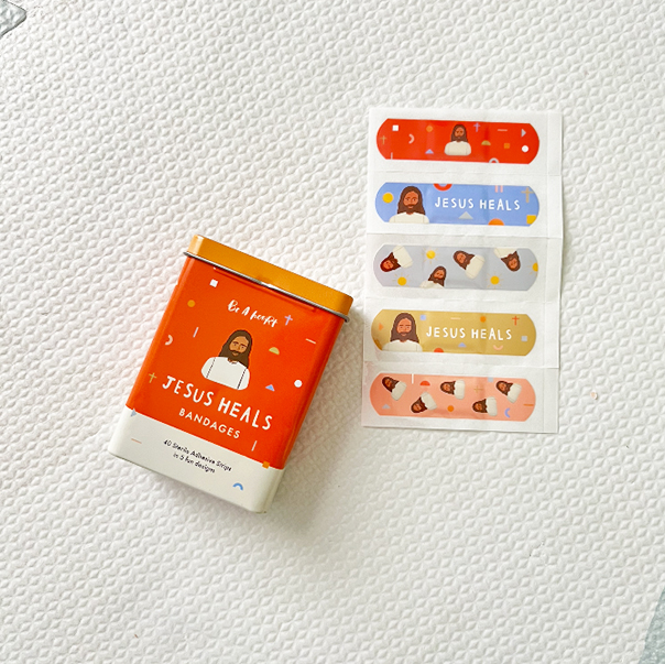 Caja metálica con 40 curitas esterilizadas con 5 divertidos diseños de Jesus Sana