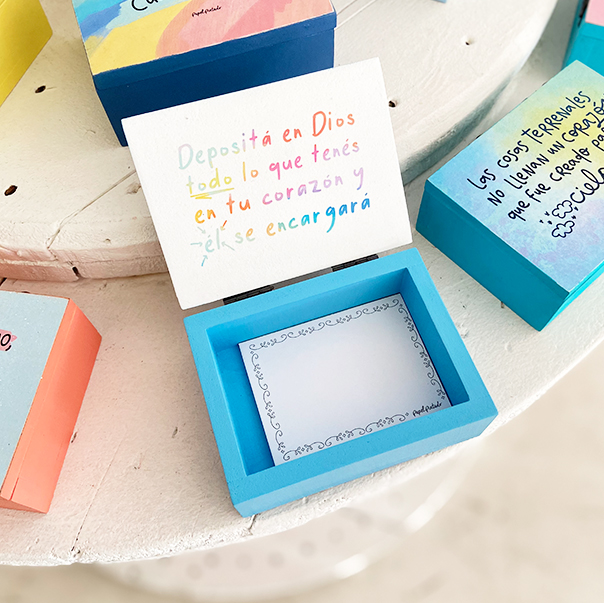 El propósito de nuestras cajitas de oración es crear el hábito de hablar con Él. Incluye un block de 30 hojitas para que escribás ahí por lo que estás agradecido, peticiones, anhelos, lo que querás. Colocala en tu mesa de noche o donde más la veas para que apenas te levantes sea lo primero que hagás. Además es el regalo ideal para cualquier persona.